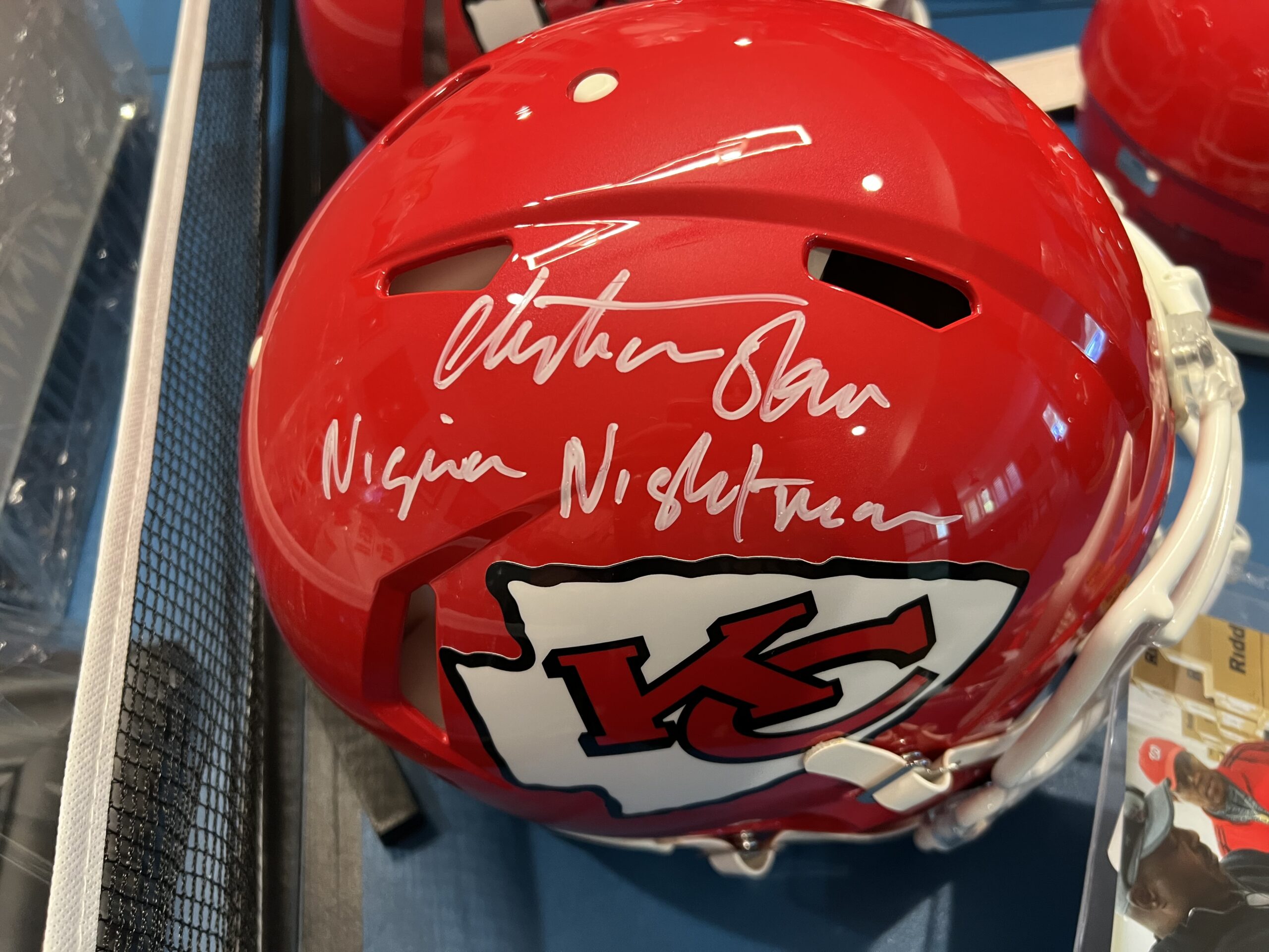 Kansas City Chiefs Full Size Helmet signed by Running Back, Christian Okoye! His personal moniker accompanies this signature, ‘The Nigerian Nightmare’.