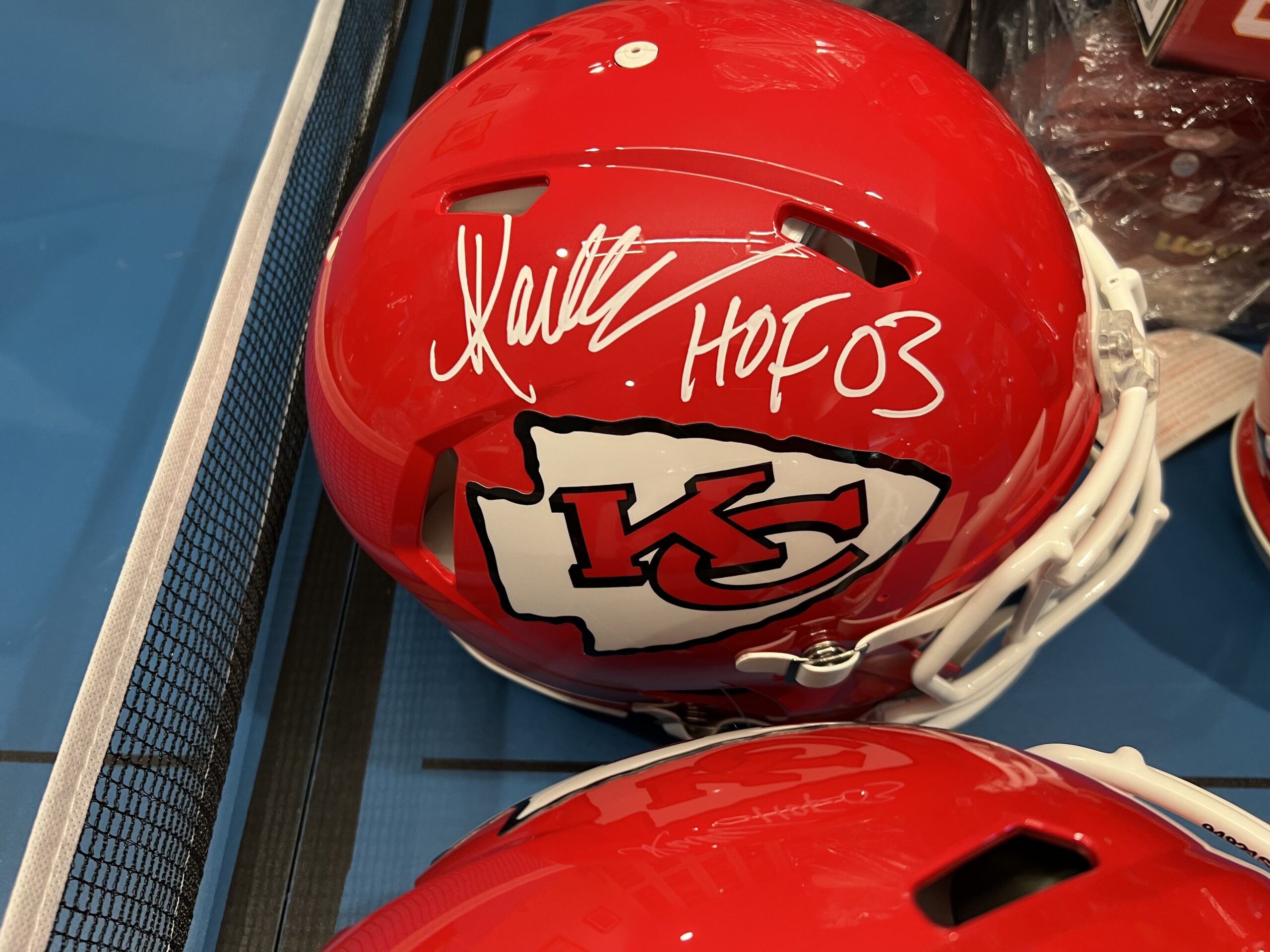 The Kansas City Chiefs signed a full-size helmet autographed by Hall of Fame running Back Marcus Allen. The signature includes the year of his induction into the NFL Hall of Fame in 2003.