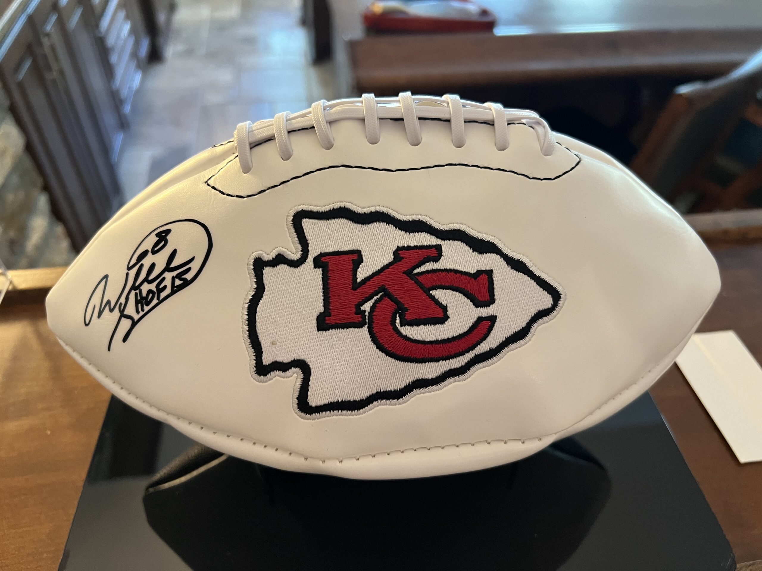 This Kansas City Chiefs Will Shields HOF Football celebrates the greatest offensive lineman in Chiefs History! The 2015 NFL Hall of Fame Inductee adds his personal touch to this collectible.