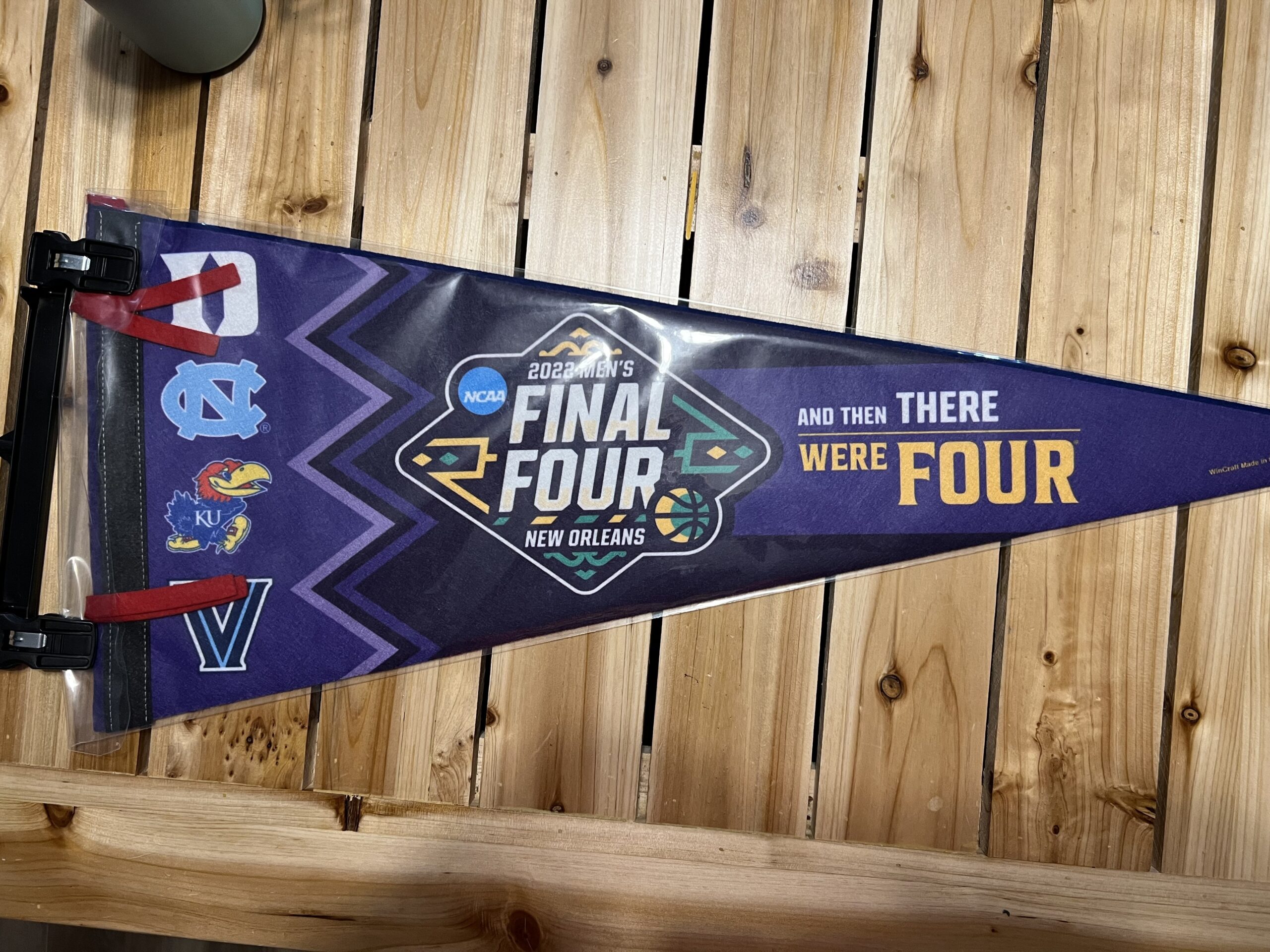 Kansas Jayhawks 2022 Final Four Pennant featuring North Carolina, Kansas, Villanoe and Duke. Ships rolled inside bubble wrap inside a box.
