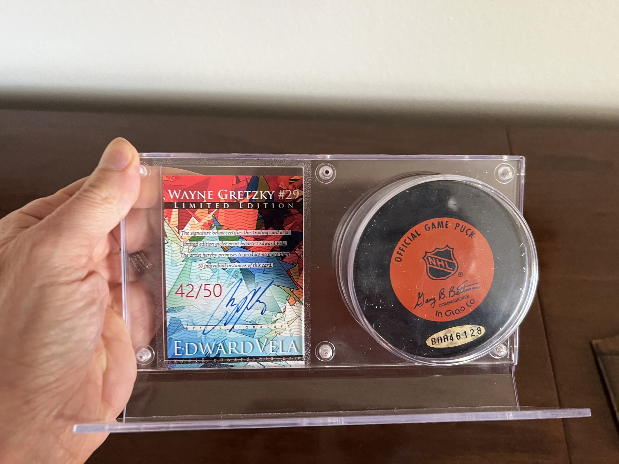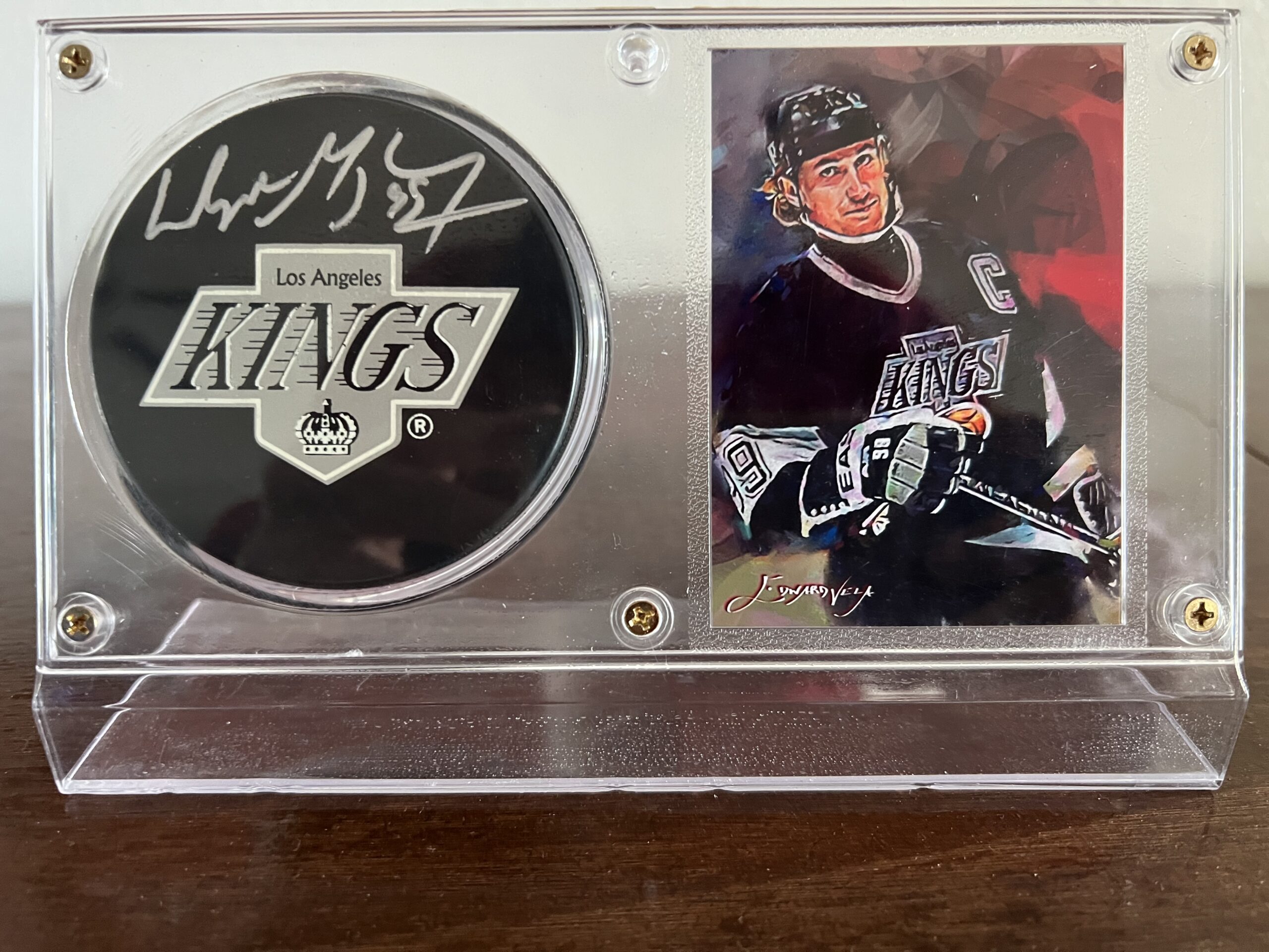 This Los Angeles Kings Hockey Puck is signed by Wayne M. Gretzky. The purchase includes a Hockey Case, a Commemorative Gretzky Puck, and two Graded Wayne Gretzky Cards. All five items will be shipped together. Wayne rarely signed pucks with his middle initial. (COA See Image 2)